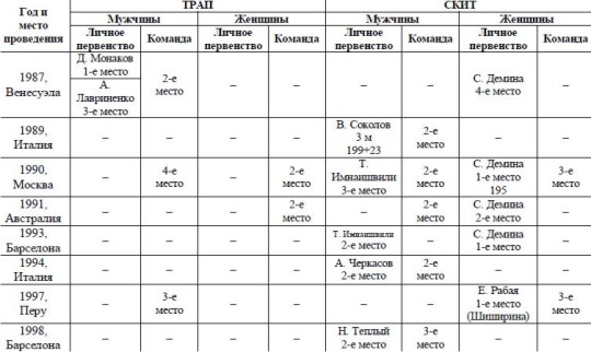 В 1985 году в жизни страны начался сложный период, это сказалось на положении дел и в спорте. Долго радовали лишь отдельные успешные выступления спортсменов и команд. В таблице 26 приведены результаты, показанные спортсменами на Чемпионатах мира в период с 1987 по 2006 годы по упражнениям Трап и Скит.